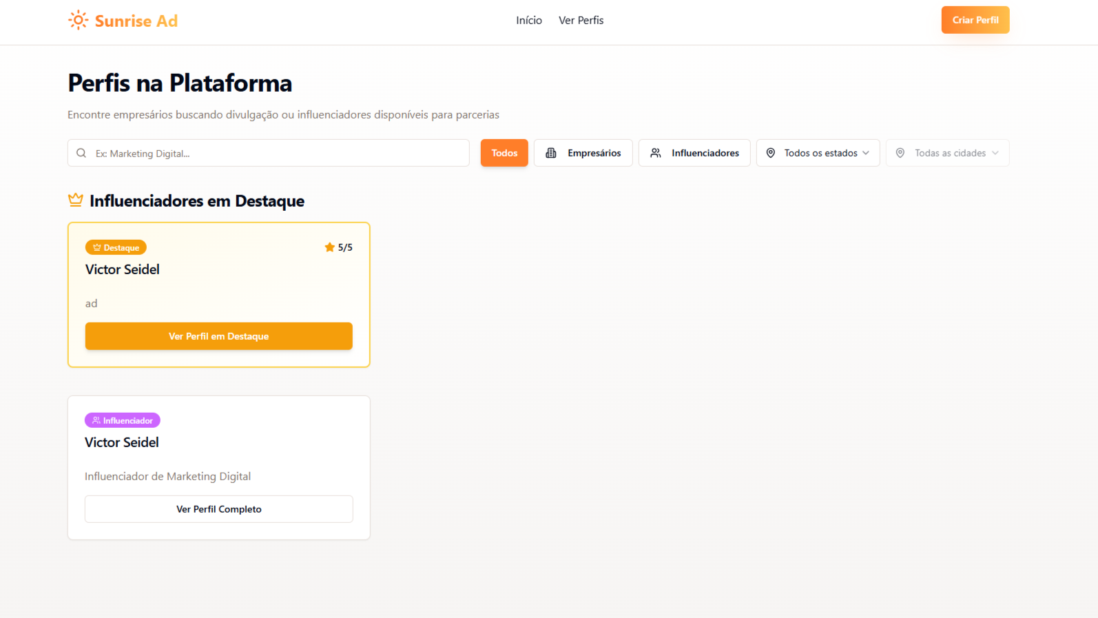 Sunrise Ad é uma plataforma SaaS que facilita parcerias entre empresários que desejam divulgar seus produtos e influenciadores prontos para promover marcas de forma estratégica.